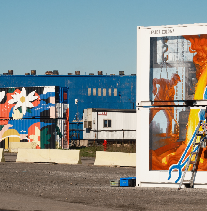 In May, we converted a sea-can container into a mobile onsite office for our Steelport project team. Next to the new office, we situated four additional 20’x8’ sea-can containers, stacked in a 2×2 formation, to provide two prominent 20’x16’ canvases for local artists to create murals that capture the legacy of the Steelport site, our vision for its future, and the spirit of Hamilton and the surrounding community.
